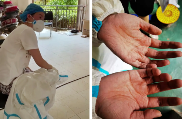 在长沙某小区 ,一名采样人员出现中暑症状;350vip浦京集团采样人员双手被汗水泡得发白、发皱